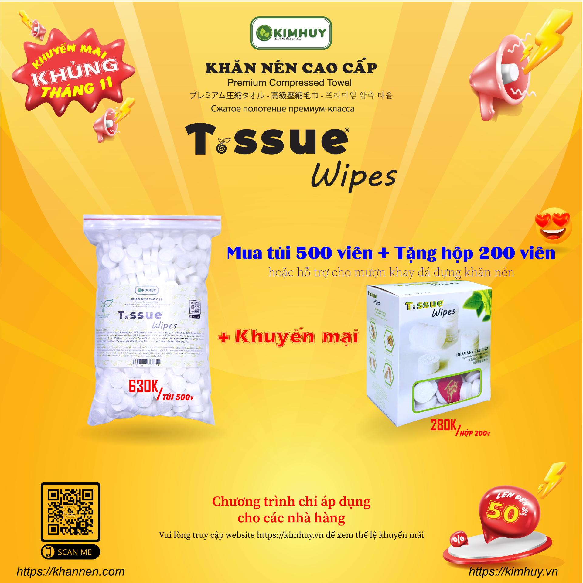 - Khách hàng mua 1 túi 500 viên khăn nén T.ssue sẽ được tặng 1 hộp khăn nén 200 viên.